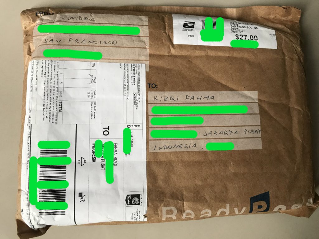 - 24 April 2021 (23 April waktu San Francisco, US): Buku dikirim Swizec dengan ongkos kirim sebesar USD27 menggunakan USPS (US Postal Service, alias kantor Pos Amerika) ke alamat saya di Jakarta Pusat.