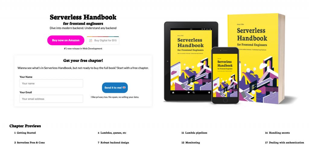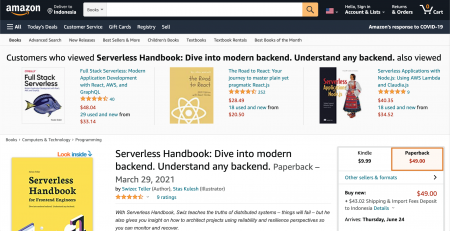 Soft copy buku Swizec dapat kalian beli langsung diwebsitenya, eh link amazon untuk membeli buku paperback di Amazonnya juga ada di website Serverless Handbook.