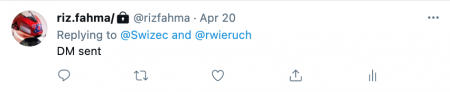 - 21 April 2021: Swizec membalas DM saya dan mengatakan bahwa saya termasuk salah satu orang yang mendapat buku gratis dengan tadantangannya (kalau tidak salah Swizec juga memberikan beberapa buku hadiah giveaway). Saya tidak menyangka Swizec membalas DM saya, apalagi memberikan buku secara gratis. Terkadang developer mendapat banyak DM dari orang-orang diseluruh dunia yang menanyakan dan meminta beragam hal.