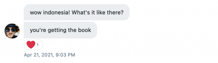 - 20 April 2021: Beberapa jam kemudian saya mengirimkan DM (Direct Message) kepada Swizec, menyampaikan minat saya terhadap buku tersebut. Disini saya berusaha saja, siapa tau bisa terpilih, walaupun punya chance yang sangat kecil.