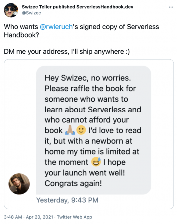 Dalam DM yang saya kirim ke Swizec, saya menyampaikan bahwa saya akan menggunakan buku tersebut untuk belajar berbagai hal tentang serverless technology, dsb. Dan dalam DM itu saya langsung mencantumkan nama lengkap dan alamat saya (in case beruntung, dan biar tidak menghabiskan banyak waktu untuk tanya jawab alamat).