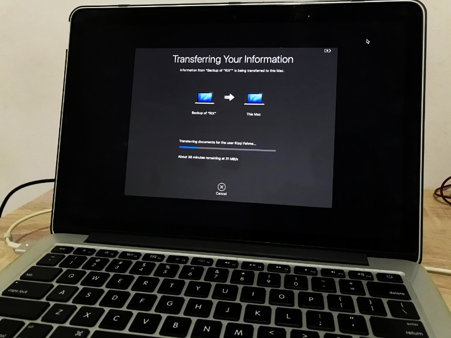 Caranya adalah dengan menggunakan aplikasi Migration Assistant (aplikasi bawaan Macbook). Masukkan HD external, lalu buka app Migration Assistant dengan menekan CMD + Space Bar secara bersamaan dan masukkan keword “Migration Assistant”.