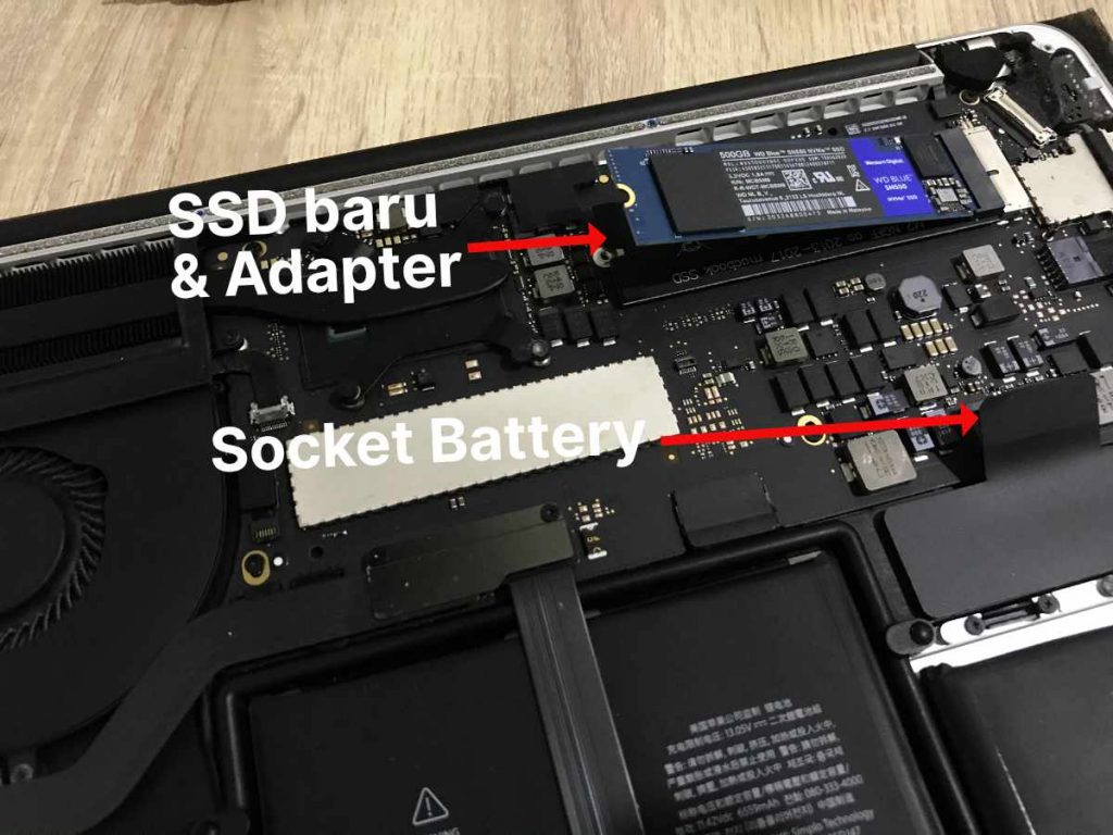 Setelah memasang SSD baru, jangan lupa pasang kembali socket battery nya. Caranya dengan menekan socket tersebut ke tempat semula, akan ada suara “klik” kecil pada saat memasang socket tersebut.