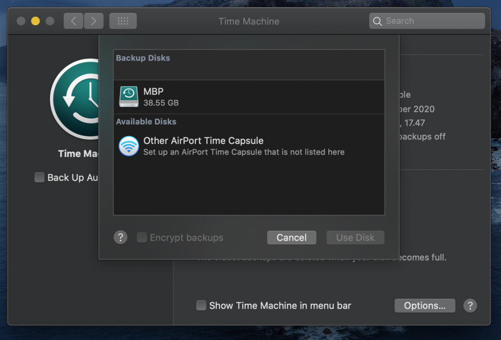 Keuntungan dari menyisakan space kosong di SSD bawaan Macbook sekitar 20an GB tadi adalah waktu back up yang lebih cepat. Sebelum mengganti SSD Macbook, sangat saya anjurkan untuk melakukan back up semua data yang ada di Macbook kamu. Caranya sangat mudah, cukup dengan membuka aplikasi bawaan Time Machine di Macbook kamu. Caranya adalah: Buka System Preferences > Time Machine > Select Disk. Pilih external storage yang tadi sudah diformat pada Disk Utility. Setelah itu, centang “Show Time Machine in menu bar.” Hal ini dilakukan untuk mempermudah akses dalam melakukan proses backup.