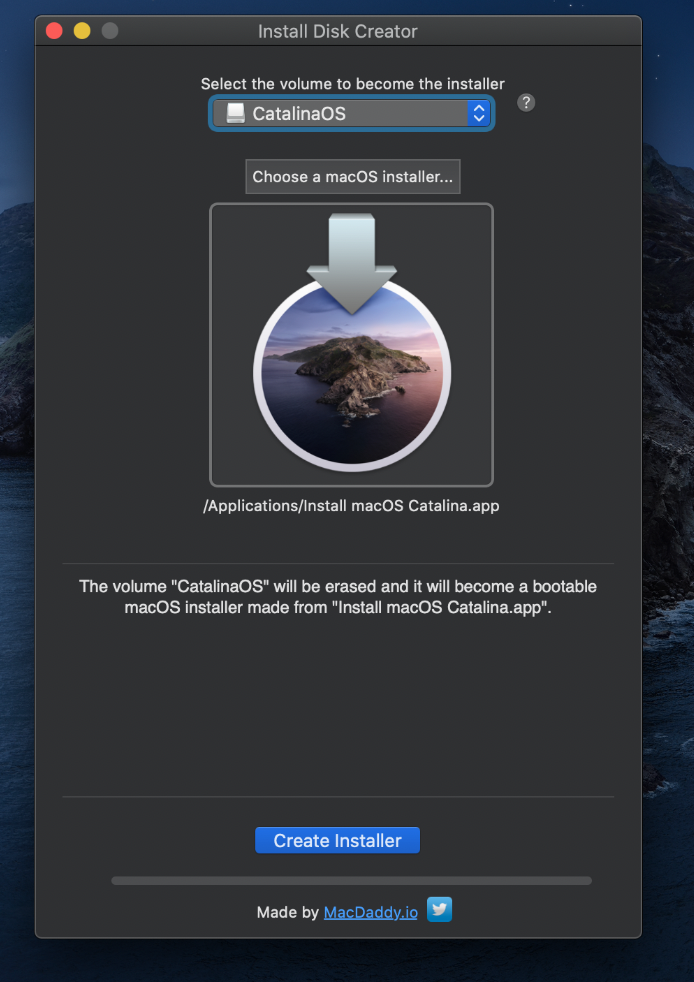 – Install aplikasi Install Disk Creator, download aplikasinya di https://macdaddy.io/install-disk-creator/ .