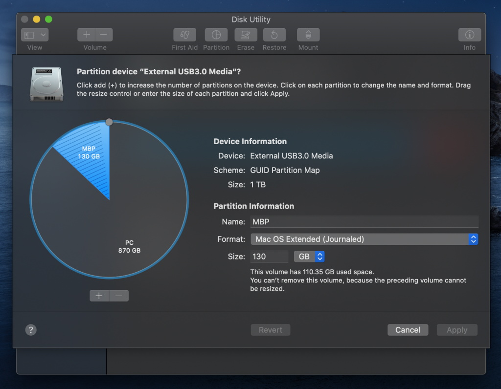 – Klik Hard Disk External / storage external yang kalian pasang (namanya muncul dalam daftar di aplikasi Disk Utility). Klik “Partition“, lalu isi nama partisi yang akan kalian buat (saya menamakannya MBP), format: “Mac OS Extended (Journaled)“, lalu isi kolom “Size” sesuai dengan size storage Macbook kamu (file yang akan dibackup), dan klik Apply. Disini saya mengalokasikan 130GB untuk partisi baru ini, dimana menurut saya sudah cukup untuk menyimpan backup Macbook saya yang kapasitas SSDnya hanya 128GB.